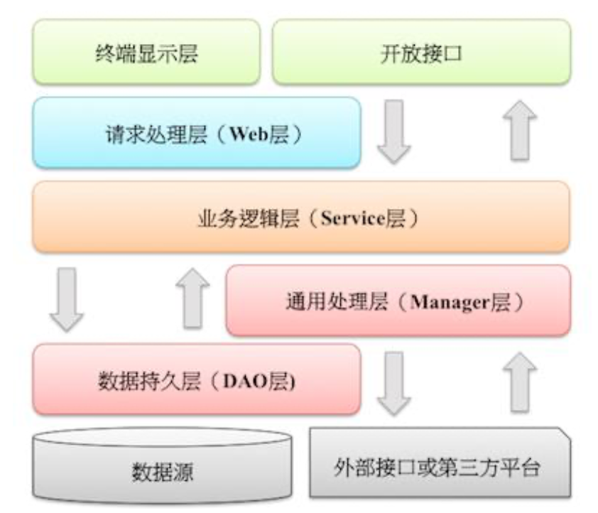 图中默认上层依赖于下层,箭头关系表示可直接依赖,如:开放接口层可以依赖于 Web 层,也可以直接依赖于 Service 层,依此类推: