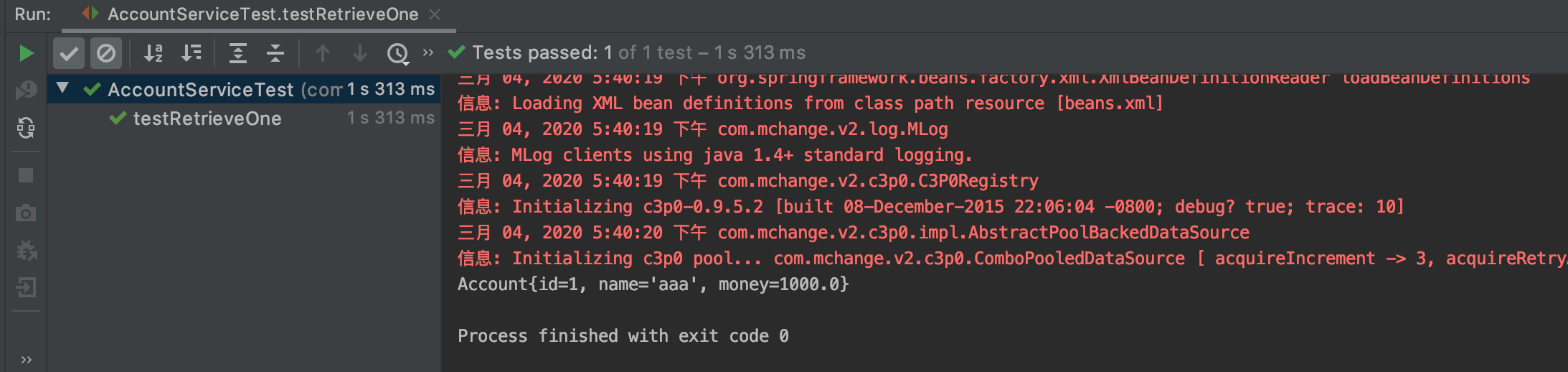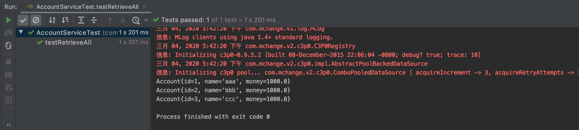 1 2 3 4 5 6 7 8 9 10 11 12 13 14 15 16 17 18 19 20 21 22 23 24 25 26 27 28 29 30 31 32 33 34 35 36 37 38 39 40 41 42 43 44 45 46 47 48 49 50 51 52 53 54 55 56 57 58 59 60 61 62 63 64 65 66 67 68 69 70 71 72 73 74 75 package com.cc.test;import com.cc.domain.Account;import com.cc.service.IAccountService;import org.junit.Test;import org.springframework.context.ApplicationContext;import org.springframework.context.support.ClassPathXmlApplicationContext;import java.util.List;public class AccountServiceTest { @Test public void testCreate () { ApplicationContext ac = new ClassPathXmlApplicationContext("beans.xml" ); IAccountService as = ac.getBean("accountService" ,IAccountService.class); Account account = new Account(); account.setName("ddd" ); account.setMoney(10f ); as.createAccount(account); } @Test public void testDelete () { ApplicationContext ac = new ClassPathXmlApplicationContext("beans.xml" ); IAccountService as = ac.getBean("accountService" ,IAccountService.class); as.deleteAccount(2 ); } @Test public void testUpdate () { ApplicationContext ac = new ClassPathXmlApplicationContext("beans.xml" ); IAccountService as = ac.getBean("accountService" ,IAccountService.class); Account account = as.retrieveAccountById(1 ); account.setMoney(2000f ); as.updateAccount(account); } @Test public void testRetrieveOne () { ApplicationContext ac = new ClassPathXmlApplicationContext("beans.xml" ); IAccountService as = ac.getBean("accountService" ,IAccountService.class); Account account = as.retrieveAccountById(1 ); System.out.println(account); } @Test public void testRetrieveAll () { ApplicationContext ac = new ClassPathXmlApplicationContext("beans.xml" ); IAccountService as = ac.getBean("accountService" ,IAccountService.class); List<Account> accounts = as.retrieveAllAccounts(); for (Account account : accounts){ System.out.println(account); } }