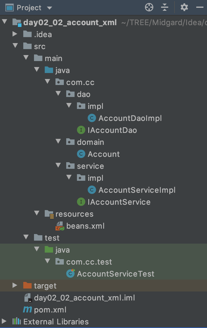 1 2 3 4 5 6 7 8 9 10 11 12 13 14 15 16 17 18 19 20 21 22 package com.cc.dao;import com.cc.domain.Account;import java.util.List;public interface IAccountDao { void createAccount (Account account) ; void deleteAccount (Integer accountId) ; void updateAccount (Account account) ; Account retrieveAccountById (Integer accountId) ; List<Account> retrieveAllAccounts () ; }