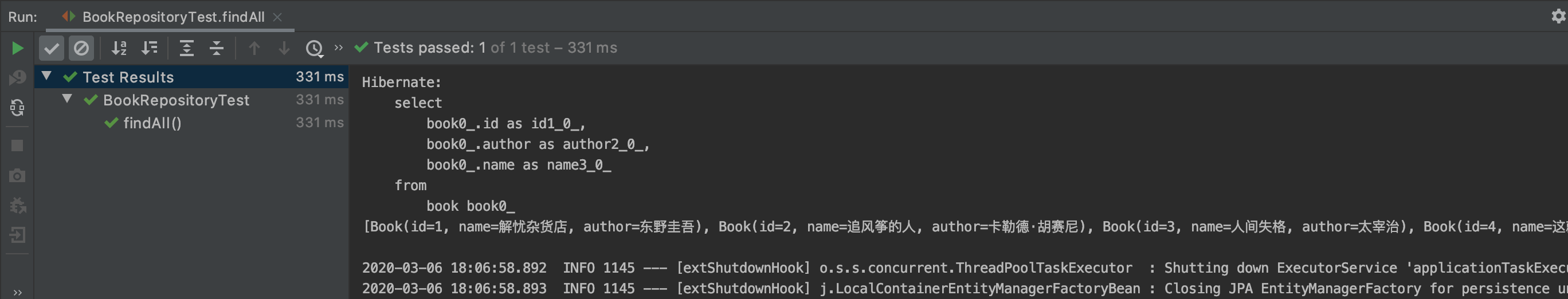 测试BookRepository 然后测试一下 建立的Spring工程自带一个测试类BookstoreServerApplicationTests 或者自己创建,在接口名上右键->Go To->Test->Create New Test 给生成的测试类加一个@SpringBootTest,要测试的类@Autowired自动注入,写的方法加一个@Test,就可以运行了