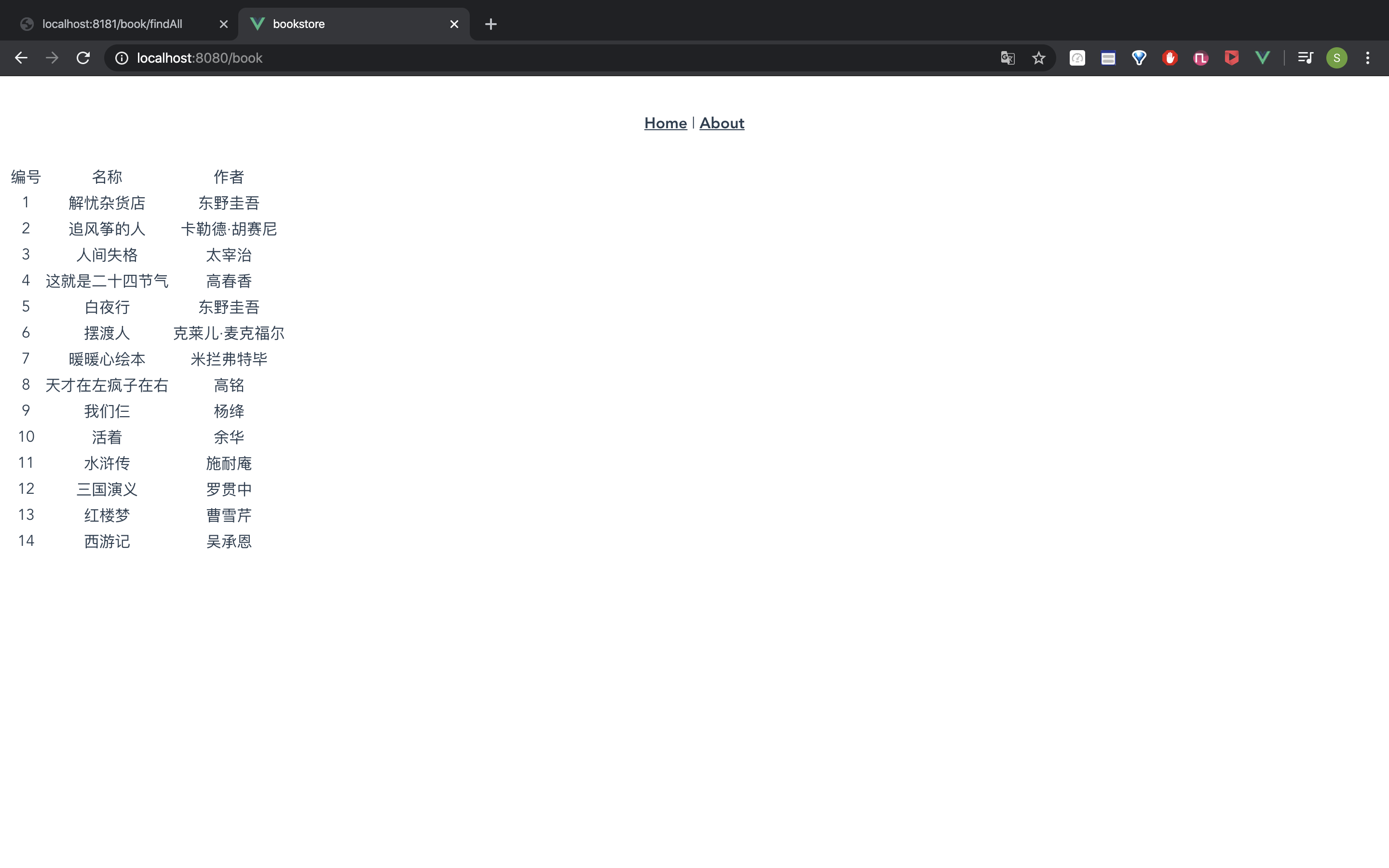 1 2 3 4 5 6 7 8 9 10 11 12 13 14 15 16 17 18 19 20 21 22 23 24 25 26 27 28 29 30 31 32 33 34 35 36 37 <template> <div id="showcase" > <table> <tr> <td>编号</td> <td>名称</td> <td>作者</td> </tr> <tr v-for ="item in books" > <td>{{item.id}}</td> <td>{{item.name}}</td> <td>{{item.author}}</td> </tr> </table> </div> </template> <script> export default { name: "Book" , data(){ return { books:[] } }, created() { const _this = this axios.get('http://localhost:8181/book/findAll' ).then(function (resp){ _this.books = resp.data }) } } </script> <style scoped> </style>