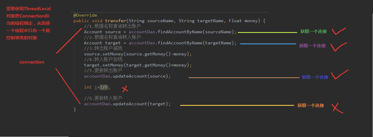 | public List<Account> findAllAccount() {         try {                          txManager.beginTransaction();                          List<Account> accounts = accountDao.findAllAccount();                          txManager.commit();                          return accounts;         }catch (Exception e){                          txManager.rollback();             throw new RuntimeException(e);         }finally {                          txManager.release();         } }