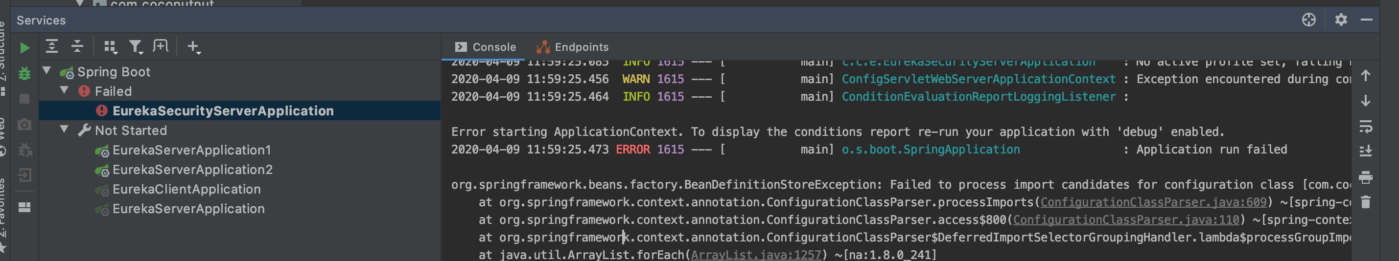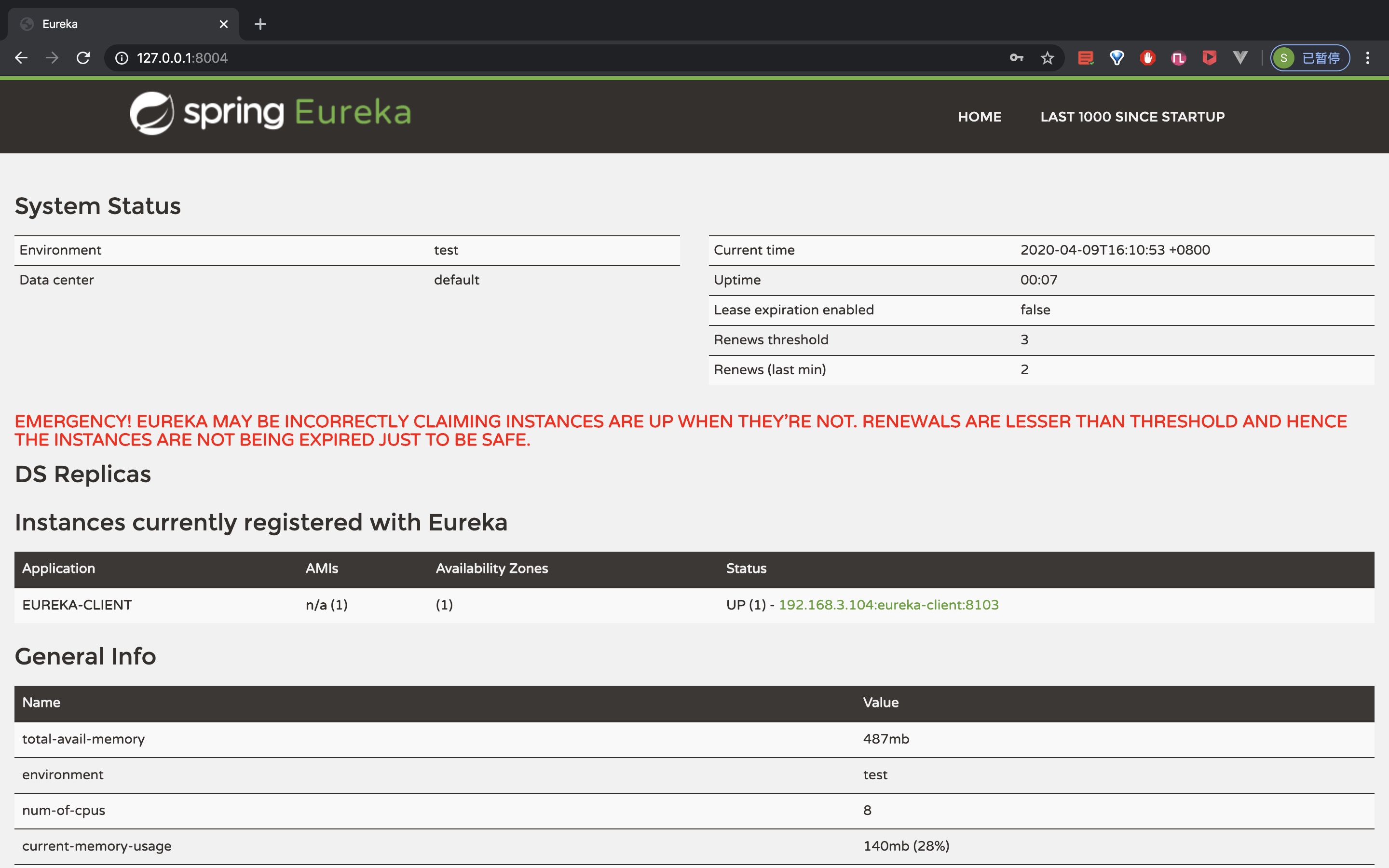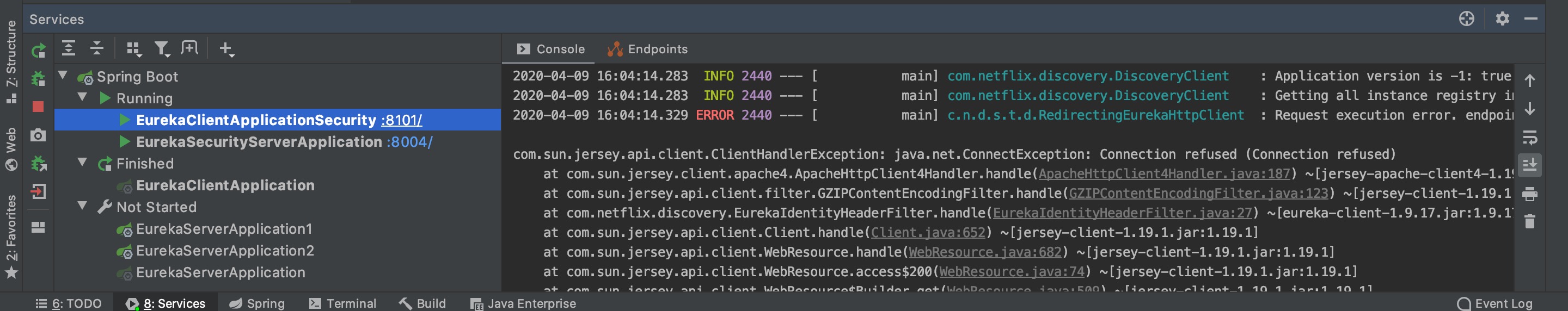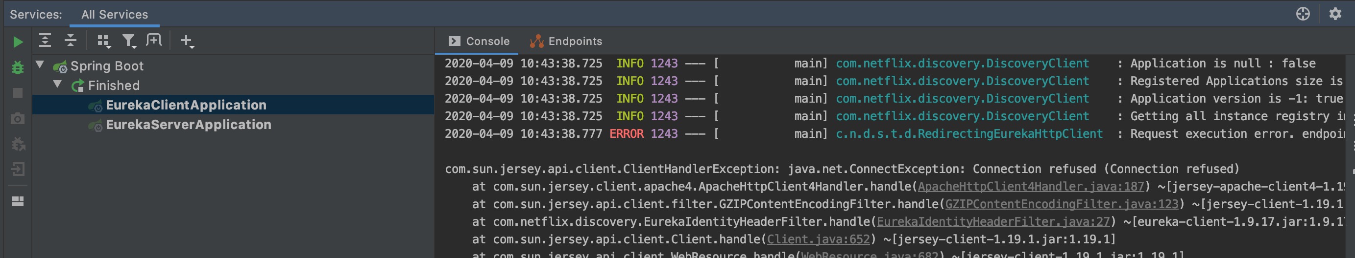 1 2 3 2020-04-09 10:43:38.777 ERROR 1243 --- [ main] c.n.d.s.t.d.RedirectingEurekaHttpClient : Request execution error. endpoint=DefaultEndpoint{ serviceUrl='http://localhost:8001/eureka/} com.sun.jersey.api.client.ClientHandlerException: java.net.ConnectException: Connection refused (Connection refused)