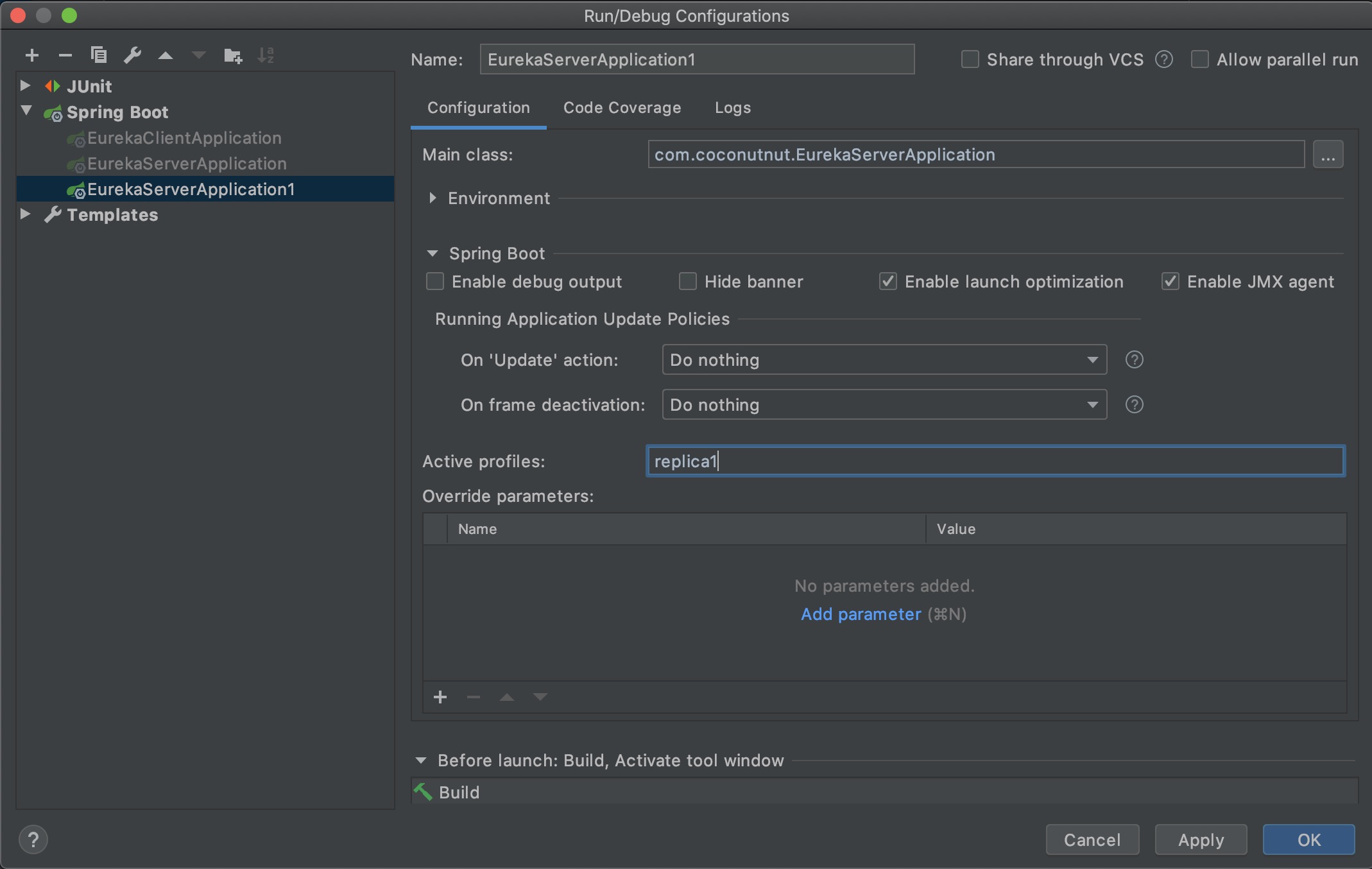配置文件2叫application-replica2.yml,hostname是replica2,Active profiles填的replica2