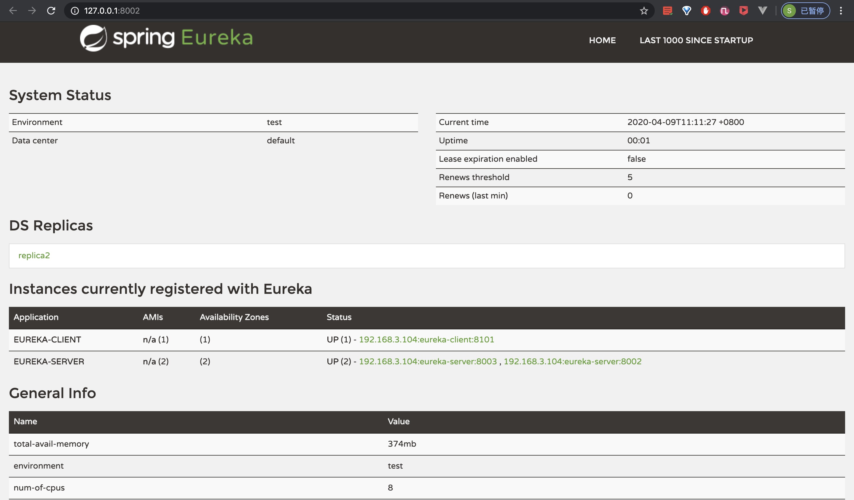 1 2 3 4 # 配置注册中心地址 # defaultZone: http://localhost:8001/eureka # 同时注册到两个注册中心 defaultZone: http://replica1:8002/eureka/,http://replica2:8003/eureka/
