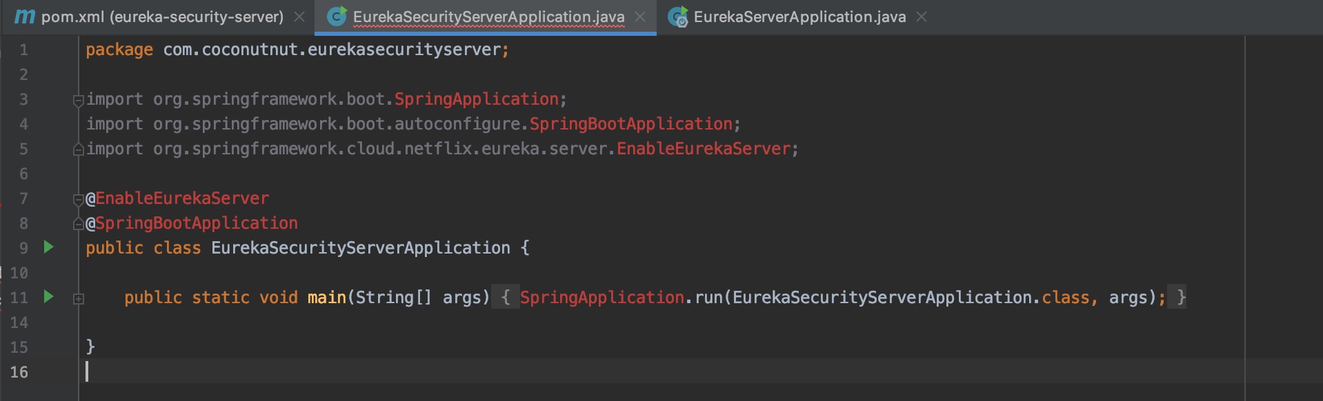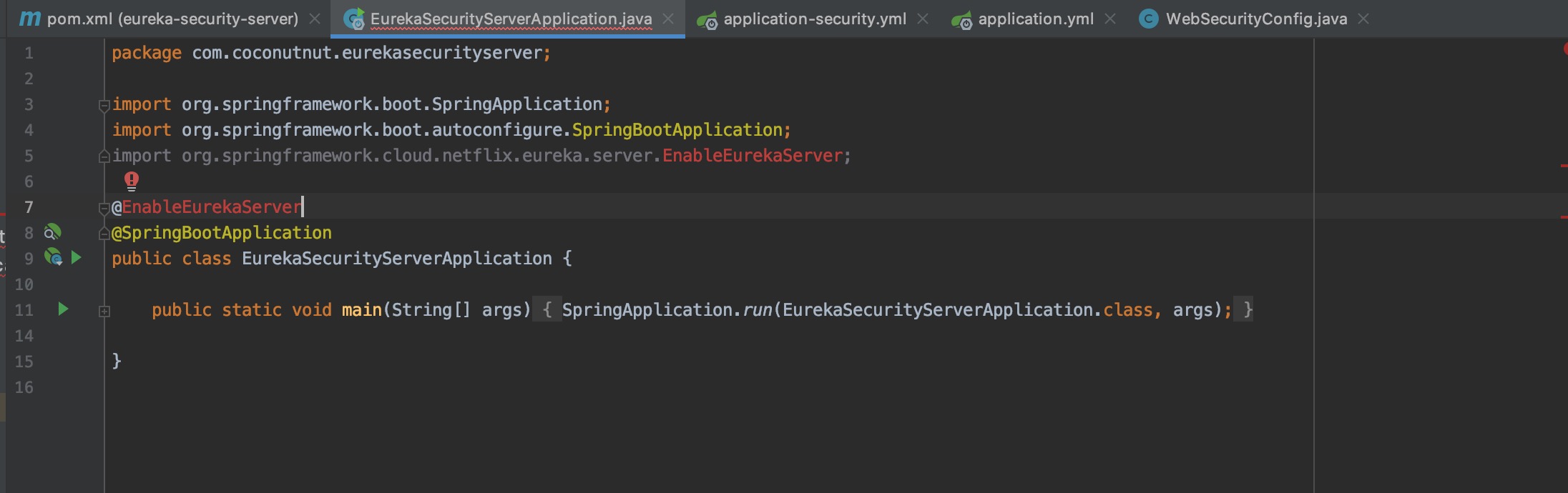 发现EurekaSecurityServerApplication没有加@EnableEurekaServer