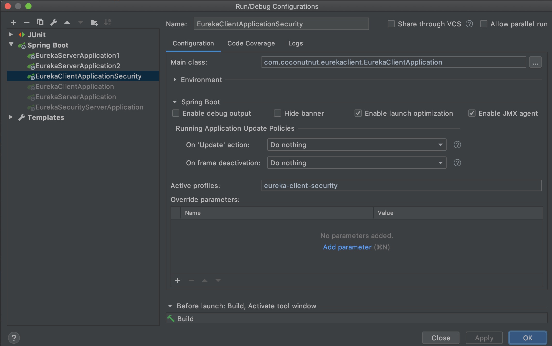 复制一个EurekaClientApplication的配置,Active profiles处改为主机名