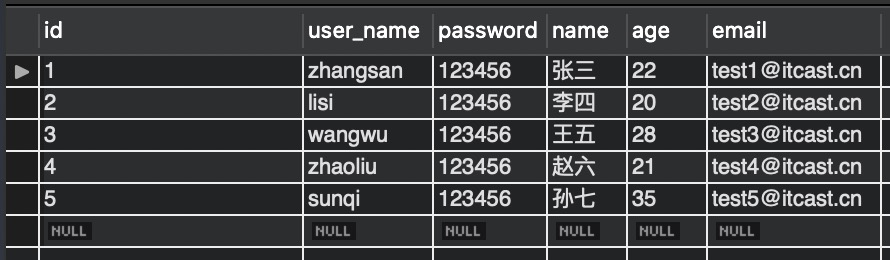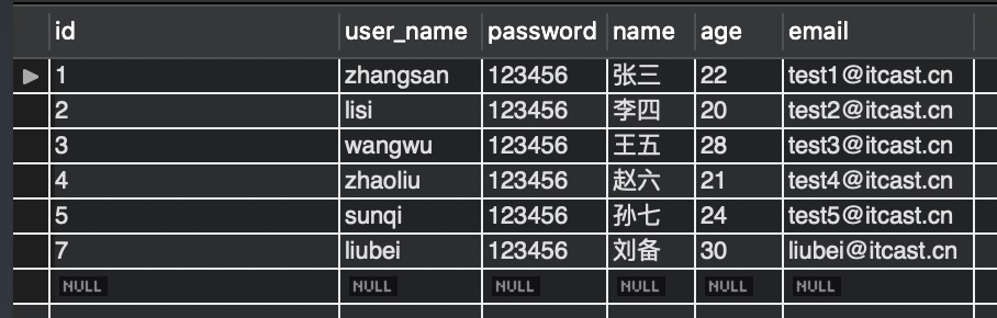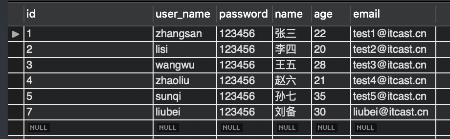 @Test publicvoidtestInsert(){ User user = new User(); user.setName("刘备"); user.setAge(30); user.setPassword("123456"); user.setUserName("liubei"); user.setEmail("liubei@itcast.cn");