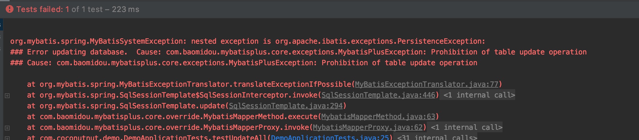 Time:2 ms - ID:com.coconutnut.demo.mapper.UserMapper.updateById Execute SQL: UPDATE tb_user SET age=30, version=2 WHERE id=2 AND version=1