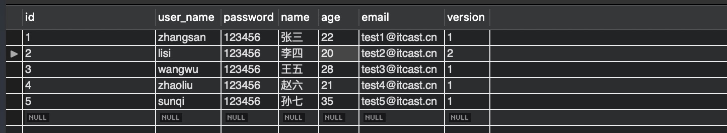 Time:1 ms - ID:com.coconutnut.demo.mapper.UserMapper.updateById Execute SQL: UPDATE tb_user SET age=30, version=2 WHERE id=2 AND version=1