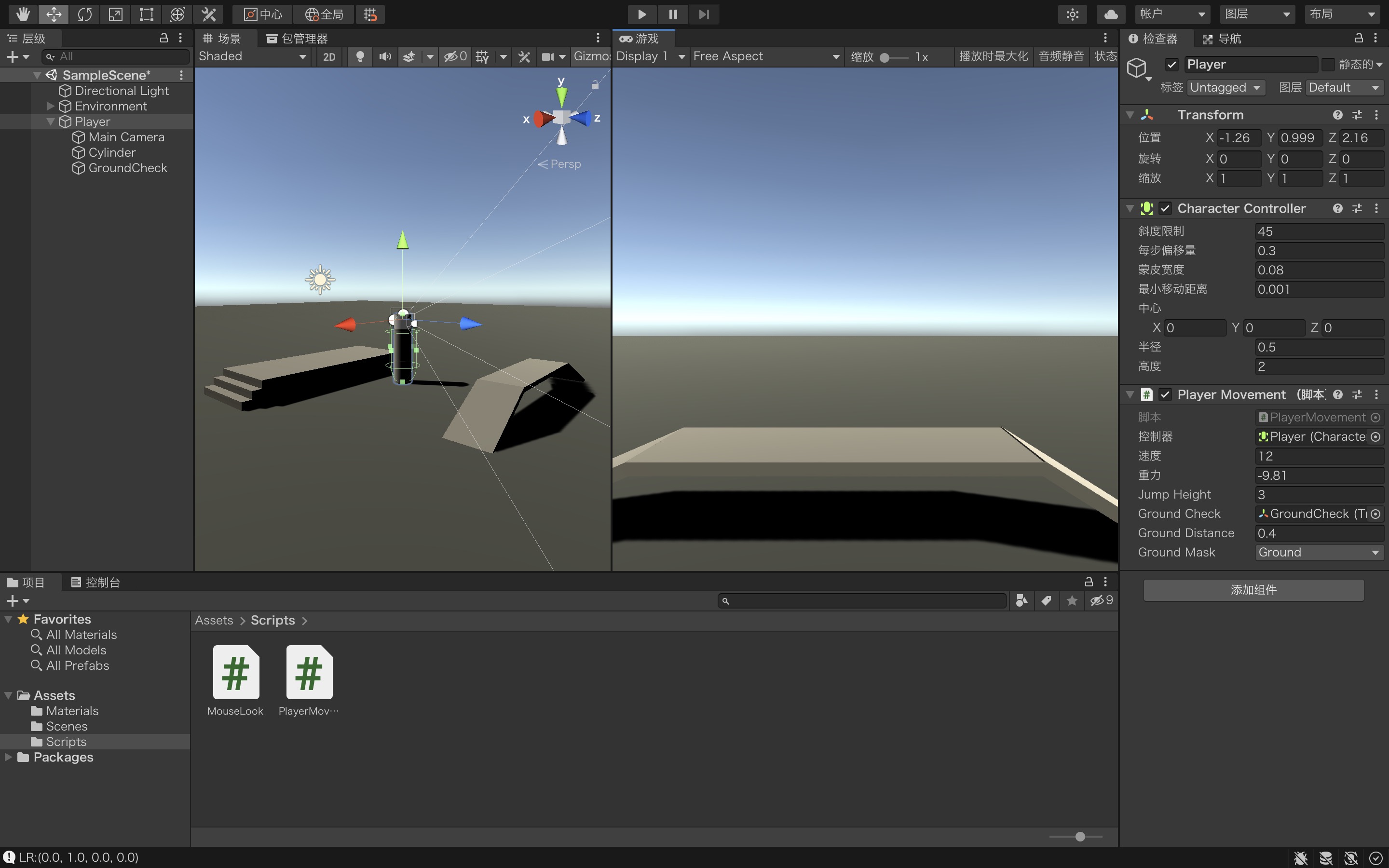 - Player(空物体)-> 加Character Controller;PlayerMovement(Script)