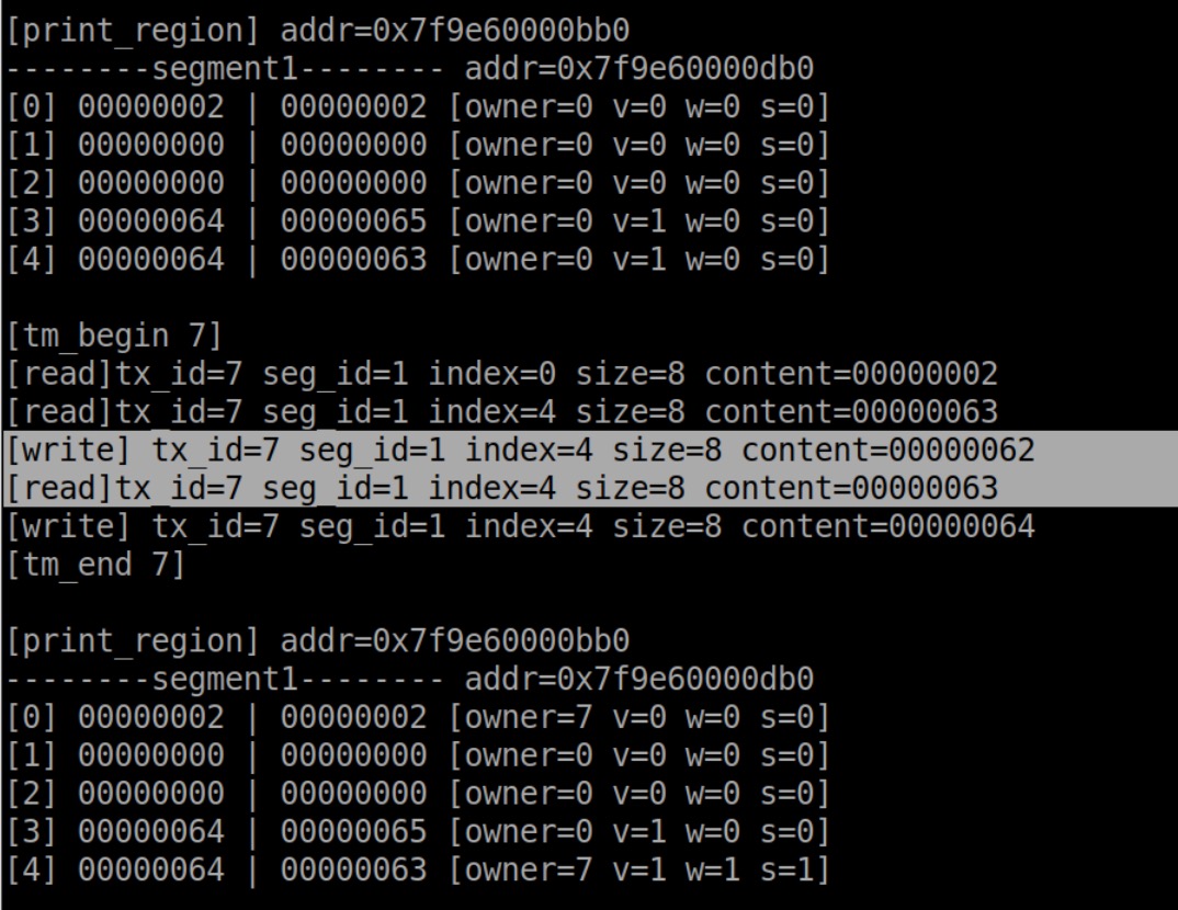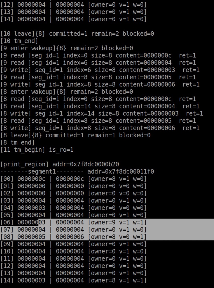 多加了一些输出,轻松复现这个bug。都是有2个transaction,A读写位置1、位置2,B在A之后读写位置3、位置2。正确情况应该是B读写位置2失败,但是现在 成功了。